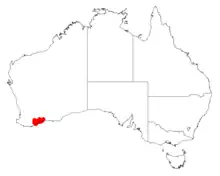 It is native to an area in the Great Southern and Goldfields-Esperance regions of Western Australia where it is commonly situated in granite river or creek beds and on spongolite breakaways growing in shallow rocky soils.[1] he range of the plant extend from around Ongerup in the west to near Ravensthorpe in the east and south to the coast around the Beaufort Inlet and Fitzgerald River National Park often as a part of low Eucalyptus woodland communities.[2]