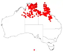 It is endemic to the tropical areas of the Northern Territory and Queensland where it is often situated on rocky hillsides or around beaches or watercourses growing in alluvial sandy soils as a part of Eucalyptus woodland or mixed shrubland communities.[2]