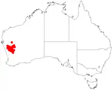 It is native to an area in the Mid West, northern Wheatbelt and Goldfields regions of Western Australia.[2] The bulk of the population is found from around Cue and Mount Magnet in the north down to around Koorda in the south and to around Morawa in the west. An isolated population is also known further north around Meekatharra.[1] It is often situated on slopes and hill crests usually over granite or occasionally ironstone as a part of Acacia woodland or shrubland communities.[1]