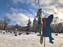 The 3-acre (1.2 ha) garden at Acequia Madre House consists of a landscape garden with fruit trees, an herb garden and lawn opposite the main entrance to the house, and a flower garden on one side of the house. In 2022, a metal sculpture by George Rodrigue was added to the landscape garden. Colors of My Mind dates from 2008 and shows Rodrigue's iconic blue dog.[10]