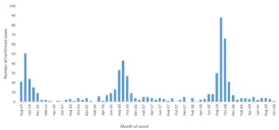 A seasonal pattern is seen in outbreaks, with a marked increase in cases reported in the late summer and early fall.[25]