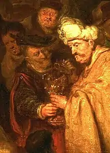 The Adoration of the Magi shows a nocturnal scene with Mary bending over the Child while the gifts of gold, frankincense and myrrh are presented by the three kings Melchior, Caspar and Balthazar with their entourages in procession. The robes of Melchior and Caspar are held by boys, continuing an Antwerp pictorial tradition started by Peter Paul Rubens. Caspar is holding the famous Amsterdam guild cup, which both reveals the Amsterdam origins of the painting and also raises the question if the other metal objects presented were equally famous. According to the museum, the painting's provenance goes back only as far as the heirs of Joan de Vries of Amsterdam in 1708.[2] Behind and above them, centrally placed in the composition, is the magi Balthazar, standing under a parasol with the star of Bethlehem shining above him.