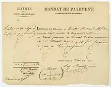 Order dated March 5, 1818 from the mayor of New Orleans to reimburse Rosette Montreuil, a free woman of color, for the work of her slave, Michel, "mulatto"