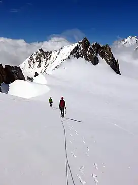 The summit is normally reached by an ascent of its northeastern ridge, from the Col de Rochefort (3,389 metres (11,119 ft)). The route is graded F+/PD- on the adjectival climbing scale.[3][4]