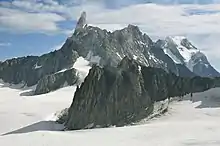 The Aiguilles Marbrées (3,535 metres (11,598 ft)), (French pronunciation: [eɡɥijmaʁbʁe], literally "marbled needles") is a mountain peak in the Mont Blanc massif, above the Glacier du Géant, with its summits forming part of the frontier between France and Italy. It is situated between the Col de Rochefort and the Col du Géant, and is easily accessed from the Torino Hut at Pointe Helbronner.