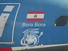 With the introduction of the airline's Boeing 787-9 aircraft in October 2018, the airline's new livery incorporated markings derived from traditional Tahitian tattoos to the fuselage, the blue color used for most of the livery was changed to a darker shade, and the airline's name written on the forward fuselage was changed to the airline's new wordmark.[23] However, despite the airline's tiare flower logo undergoing a visual change during the airline's overall rebranding, the logo used on the aircraft's tailfin was largely unchanged from the previous version.[7]