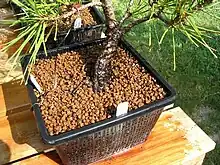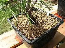 Akadama (赤玉土, akadamatsuchi, red ball earth) is a naturally occurring, granular clay-like mineral used as soil for bonsai trees and other container-grown plants. It is surface-mined, immediately sifted and bagged, and supplied in various grades; the deeper-mined grade are somewhat harder and more useful in horticulture than the more softer, shallow-mined grades. Akadama may also act as one component of growing medium when combined with other elements such as sand, composted bark, peat, or crushed lava. The color darkens when moist which can help the grower determine when to water a tree. [1]