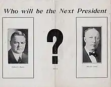 Reporter Frederick William Wile made the oft-repeated observation that Smith was defeated by "the three P's: Prohibition, Prejudice and Prosperity".[12] The Republican Party was still benefiting from an economic boom, as well as a failure to reapportion Congress and the electoral college following the 1920 census, which had registered a 15 percent increase in the urban population. Smith's economic conservatism and anti-prohibition stance likely contributed to his inability to coalesce support amongst rural progressives.[13] Smith's opponent, Republican nominee Herbert Hoover, was vastly popular. Additionally, Hoover was running on the record of an immensely popular incumbent Republican president, Calvin Coolidge.[6] Hoover benefited incredibly from the perception of Republican-led economic prosperity, which, less than a year later, would be proven to have been an illusion.[2]