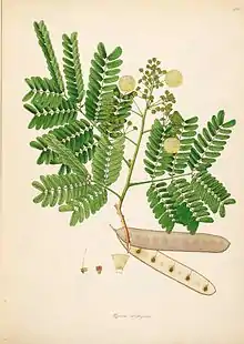The fragrant flowers are white withering to a pale orange, appearing in large terminal clusters. Mature pods are reddish-brown, thin and flat, from 13–20 cm (5.1–7.9 in) long and 2–4 cm (0.79–1.57 in) wide, and contain eight to twelve reddish-brown seeds, each weighing about 0.5 g (0.018 oz). The bark is dark grey with horizontal lenticels. Leaves are bipinnately compound, downy, with three to nine pairs of pinnae and ten to thirty pairs of pinnules.[3] Seeds germinate readily with a high viability, but are often damaged by Bruchidius beetles of the family Chrysomelidae.[4]