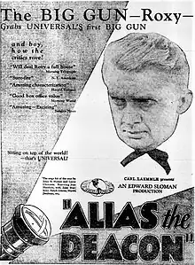 Alias the Deacon is a 1927 American silent drama film directed by Edward Sloman and starring Jean Hersholt, June Marlowe, and Ralph Graves. It was produced and released by Universal Pictures. Based on a stage play of the same name, it was directed by Edward Sloman and is preserved at the Library of Congress Packard Campus for Audio-Visual Conservation.[1][2] It was remade as the sound film Alias the Deacon in 1940.