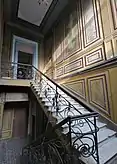 The interior space of the residential building is especially saturated with artistically executed interiors including the vast lobby of the two-story staircase outside the front rooms, ornamented with decorative panels with landscapes and genre scenes made by the architects-designers and painters who worked here. From the mezzanine, a wide glazed corner gallery leads to all the ceremonial rooms.[2]