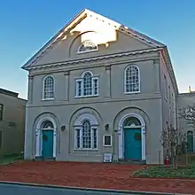 As the population of Frederick grew in the late-18th and early-19th centuries, the need for a larger, more accessible church led the vestry of All Saints Parish to call for the construction of a new building on a lot purchased from Dr. Philip Thomas and Richard Potts on Court Street. The vestry raised subscriptions and held a lottery to obtain the funds to build the new church which was completed in 1814.[8] Designed by Henry McCleery, the second All Saints' Church is an example of Federal design with Palladian influences. The first floor doors and window display a unique inter-woven design carved into their architraves. The second-floor windows are separated by stuccoed pilasters and a fanlight is centered in the pediment above. This new building was consecrated by Bishop Claggett on November 12, 1814.