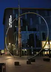Alliance is a 25-metre-high (82 ft) sculpture in the centre of Cardiff, Wales, created by Paris installation artist Jean-Bernard Metais. It consists of a large, partly enamelled, stainless steel arrow, and a hoop that glows in the dark. It was financed by the St David’s shopping centre as part of a £1.5m public art scheme in the city centre, and was unveiled on 3 December 2009.[1]