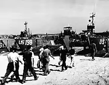 The logistics plan provided for delivery of five days' supply of petrol, oil and lubricants (POL) and subsistence every three days, thus building up reserves by two days every three. The troops would land with five units of fire of ammunition.[30] A unit of fire was a somewhat arbitrary measurement for accounting purposes, and was different for each type of ammunition.[31] It was 60 rounds for the M1 carbine, 150 for the M1 Garand rifle, 750 for the M1918 Browning Automatic Rifle (BAR) and 900 for the M1919 Browning machine gun.[32] Each day five units of fire would arrive with the troops landing that day, plus 1+2⁄3 or 3+1⁄3 additional units of fire to maintain those already ashore, alternating on successive convoys.[27]
