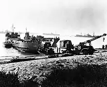 Seventh Army assigned port battalion crews to specific ships. The stevedores loaded the ship, then traveled on it to southern France, where they unloaded it. Since they knew the contents of the ship and the location of items on board, this permitted the quick unloading of specific and urgent items.[54] Convoys arrived in daylight and departed at night.[57] Cargo was unloaded using cargo nets. Each of the engineer combat regiments in the beach groups was provided with 600 cargo nets, and each cargo ship arriving off the beach brought another 110, which were retained on the beaches. Nets were placed on the shore where LCTs beached, and cargo was piled onto them. Motor cranes, A-frames mounted on DUKWs and 6x6 trucks with Quickway cranes were then used to lift the cargo onto trucks, which took it to a dump where it was unloaded using a crane. The trucks then returned to the LCTs with nets from the dump. Cargo ships were unloaded by lowering cargo in cargo nets onto DUKWs. There was a general shortage of cargo nets owing to too many ships being unloaded at once, too few trucks to move the cargo to the dumps, and insufficient personnel to unload the cargo at the dump sites.[59] As an expedient, cargo was often tipped from the net onto the ground at the dump site, with consequent breakages.[60]