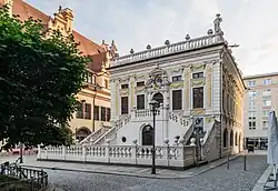 Leipzig has always been an important trading centre, being at the intersection of two historical trade routes, and trade fairs have been held here for nearly a millennium.[2] The initiative to build a Börse, as a neutral exchange place to conduct business and seal deals, came in 1667 from 30 major merchants after complaints by foreign merchants.[3] The city council took the decisive decision to build the Börse on 6 May 1678. The building was probably designed by Johann Georg Starcke,[4] a master builder at the court of John George II, Elector of Saxony, in Dresden.[5] Construction began at the Naschmarkt adjacent to the Old Town Hall on 30 May 1678. The Börse was used already from 1679, but the artwork in the interior was completed only in 1687.[6] The ground floor had rooms rented to merchants, the upper floor offered a hall, Börsensaal, for auctions, balls and other events.[5]