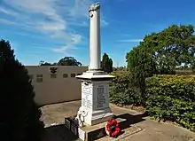 The Alton Downs War Memorial was officially unveiled on 16 October 1920 by Mrs H.G. Wheeler to honour those from the district who served in World War I. The memorial is made of Ulam marble and is a 12-foot (3.7 m) broken column (signifying young life cut short). It cost £180 to erect and the stonemason was Frederick Moulton Allan of Rockhampton.[14][15][16]