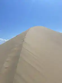 The "Singing Dunes" are located 300 kilometers (190 mi) from Almaty National Park. The area is referred to as the Singing Dunes on account of the rumbling sound emitted from the sand. The Singing Barchan dune is 1.5 km (0.93 mi) long and 120 m (390 ft) high. The barchan is crescent-shaped. When the wind is blowing from the west dispersing the sands, it can sound as if a pipe organ is playing. The cause of this phenomenon is still a mystery, but scientists theorize that in hot dry weather the sand gets electrified due to friction and creates a certain sonic vibration.[8]