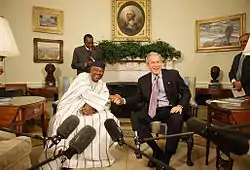 His presidency was atypical, in part due to the fact that he was not a member of any political party and that he included members from all of the country's political parties in his government.[11] Following his 2002 election, he appointed Ahmed Mohamed ag Hamani as Prime Minister, but on 28 April 2004, Hamani was replaced by Ousmane Issoufi Maiga, who in turn was replaced on 28 September 2007 by Modibo Sidibé.[12]