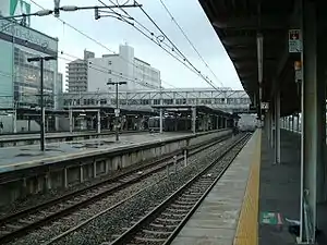 Amagasaki Station (尼崎駅, Amagasaki-eki) is a railway station on the Tōkaidō Main Line (JR Kōbe Line), Fukuchiyama Line (JR Takarazuka Line) and JR Tōzai Line of West Japan Railway Company (JR West), located in Amagasaki, Hyōgo, Japan. Until 1997, Amagasaki was only a local stop, but it has since become a major junction with the opening of the JR Tōzai Line. Today, all commuter trains and limited express trains bound for the Fukuchiyama Line stop here.