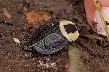 Adults are 12 to 22 mm long. The pronotum is primarily a pale yellow with a black spot in the center. In the southern portion of the range, the elytra are entirely black while in the northern portion they have a yellow rear tip. The elytra are shorter than the body of the beetle, leaving the tail end slightly exposed. The larvae are black and appear armored.[3]