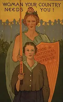 Social status often dictated the way in which a woman was involved in the war effort. Working-class women were generally the ones enlisting in the armed forces or taking over jobs left behind, while middle and upper-class women generally participated in voluntary organizations.[20] These were the women with more free time, whose living standards did not necessitate that they earn a salary. One prominent issue at the outset of the war was how to organize and coordinate female support and service, which led for female leaders to push for the creation of the Woman's Committee of the Council of National Defense (WCND), established by the Wilson administration to serve as an advisory committee.[21] The Committee appropriated projects to voluntary organizations such as the Red Cross, Women's Temperance Union and others, in order to drum up support for the war and mobilize the female half of the population amidst rising manpower concerns.