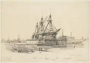 From 1859 there is a drawing of the dry dock by Johan Conrad Greive (1837-1891). It shows De Javaan on the dry dock. De Javaan is mentioned in an 1860 overview as a frigate under Captain H. Munnix. Flag No. 275, shipping line J. Kooij and J. Kooij Jr. capacity 736 ton, and dating from 1826.[10] Javaan arrived from Batavia in Texel on 14 May 1859.[11] On her next return voyage she ran aground near Egmond aan Zee in January 1861, but got free on her own.[12] In March 1861 the frigate Javaan of 736 ton or 389 last was offered for sale in the Oosterdok.[13] "De Javaan" was a special ship, because it had been built in the Dutch East Indies. As such a note by J. Kooij Jr. about her good qualities made it into a political debate about building navy ships in the Dutch East Indies, instead of sending them from the Netherlands.[14]