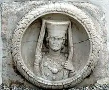 Since almost no depictions of women survive from the La Tène period, archaeologists must make do with Roman provincial images. In these, women are seldom depicted bare-headed, so that more is known about headcoverings than about hairstyles. Celtic women of this time wore winged caps, felt caps in the shape of upturned cones with veils, cylinder-shaped fur caps, bronze tiaras or circlets. The modius cap was a stiff cap shaped like an inverted cone which was especially common in the first century AD around Virunum. It was worn with a veil and rich decoration and indicated women of the upper class. The veil worn over the cap was often so long that it could cover the entire body. In north Pannonia at the same time, women wore a fur cap, with a spiked brim, a veil cap similar to the Norican one and in later times a turban-like head covering with a veil.[84] Among the Celtiberian women a structure, which consisted of a choker with rods extending up over the head and a veil stretched over the top for shade, was fashionable.[85]
