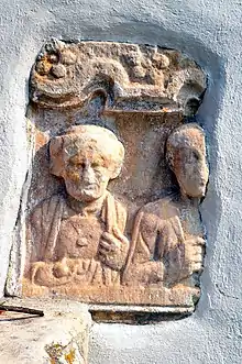 On a first century AD Celtic gravestone from Wölfnitz, a girl is depicted in Norican clothing. It consists of a straight under-dress (Peplos) which reaches to the ankles, a baggy overdress reaching to the knees, which is fastened at the shoulders with large fibulae. A belt with two ribbons hanging down at the front holds the dress in place. In her right hand she holds a basket, in her left hand she holds a mirror up before her face. On her feet there are pointed shoes. Her hair is mostly straight, but coiffed at the back.[76]