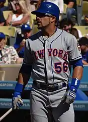 On Opening Day (April 5) 2012, Torres re-injured his left calf—which he had previously hurt during 2012 spring training—and spent much of April on the disabled list.[66] He was activated on April 30.[67] However, though he would receive most of the starts in center field, he began to platoon with Kirk Nieuwenhuis, who had filled in for him when he was on the disabled list. This continued until July 29, when Nieuwenhuis was returned to the minor leagues, enabling Torres to be the full-time starter for the rest of the season.[68][69][70] Torres endured a career-worst 0 for 18 streak that he finally snapped with a hit against Rafael Betancourt on August 20 in a 31 loss to the Colorado Rockies.[5][71] In 132 games (374 at bats), he hit .230 with 86 hits, 17 doubles, seven triples, three home runs, 35 RBI, and 13 stolen bases (in 18 attempts). As a right-handed hitter, he batted .286. He joined José Reyes as the only players in Mets' history to have two games in a season with a triple and home run.[5] Following the season, he filed for free agency.[24]