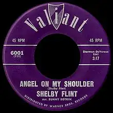"Angel on My Shoulder" is a song written and recorded by Shelby Flint that was released on a Valiant Records 45 rpm single in 1960 and on her self-titled debut album in 1961.[1][2] The single reached No. 22 on the US Billboard Hot 100 singles chart in early 1961. It was Flint's only Top 40 hit.[3]