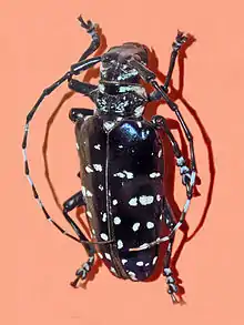Anoplophora sollii can reach a length of about 47–57 millimetres (1.9–2.2 in).[2] These beetles are glossy black or bluish, with 20-40 irregular white spots on the elytra and very long ringed antennae.[3]