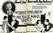 Another Man's Shoes is a 1922 American comedy film directed by Jack Conway and written by Victor Bridges, Raymond L. Schrock, and Arthur F. Statter. It is based on the 1913 novel Another Man's Shoes by Victor Bridges. The film stars Herbert Rawlinson, Barbara Bedford, Una Trevelyn, Nick De Ruiz, Josef Swickard, and Jean De Briac. The film was released on November 6, 1922, by Universal Film Manufacturing Company.[1][2][3]