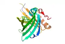 Characteristic for Anticalin proteins is their barrel structure formed by eight antiparallel β-strands pairwise connected by loops and an attached α-helix. The main structure of Anticalin proteins is identical to wild type lipocalins. Conformational deviations are primarily located in the four loops reaching in the ligand binding site.[2] Mutagenesis of amino acids at the binding site allows for changing the affinity and selectivity.