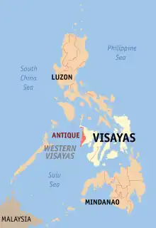 Antique's at-large congressional district, also known as Antique's lone district, is the sole congressional district of the Philippines in the province of Antique. Antique has been represented in the country's various national legislatures since 1898.[3] Since 1907, Antique has been entitled to one member in the House of Representatives of the Philippines, elected provincewide at-large, except for a brief period between 1943 and 1944 when a second seat was allocated in the National Assembly of the Second Philippine Republic.[4] It was also earlier represented by three members in the First Philippine Republic legislature known as the Malolos Congress from 1898 to 1901.[3]
