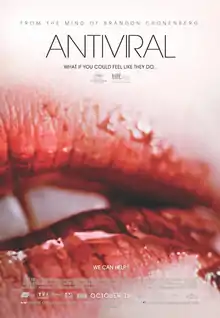 Antiviral is a 2012 science fiction horror film written and directed by Brandon Cronenberg. The film competed in the Un Certain Regard section at the 2012 Cannes Film Festival.[4][5] Cronenberg re-edited the film after the festival to make it tighter, trimming nearly six minutes out of the film. The revised film was first shown at the 2012 Toronto International Film Festival,[6] and was a co-winner, alongside Jason Buxton's Blackbird, of the festival's Best Canadian First Feature Film award.[7]