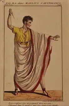La Fosse's chef d'œuvre Manlius Capitolinus (1698) about Marcus Manlius Capitolinus (died 384 BCE), was imitated from the English dramatist Thomas Otway's play Venice Preserv'd, who in turn had taken his plot from César Vichard de Saint-Réal's Conjuration des Espagnols contre la République de Venise en l'Année M. DC. XVIII (1674).[13][14][15] La Fosse's later plays were not as successful, but according to theater historian Phyllis Hartnoll in The Oxford Companion to the Theatre, many of his contemporaries thought he might have rivalled Jean Racine had he began his dramatic career earlier.[16]
