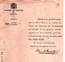 After several months in prison, Pérez was finally sentenced to death at the age of 39 in Ceuta on 17 November 1937.[1][4] She received two death sentences. The first was for belonging to International Red Aid's Ceuta branch. The second was for belonging to the Communist Party.[3][1] Her death sentence was in part because supporting these two organizations was seen as part of a wider imminent plot by communities to create a foreign, Soviet influenced revolution in Spain.[1] She was sentenced along with two other women, Andrea Maese Vázquez and Francisca Gutiérrez Hernández, for the same reasons.[1] Joaquina Garriga Mosquecho and Ana Sánchez González were two of the other five total women in Ceuta to receive death sentences that year.[1] They were the only five women in Ceuta to be given death sentences by Nationalist forces in the period between 1936 and 1942.[1] The death sentences were handed down without the benefit of a trial.[9] Her death sentence was later commuted to 12 years in prison.[6] She would spend the next eight years with time spread out between several prisons, including Cárcel de Mujeres del Sarchal in Ceuta, in Cádiz, in Burgos, and in Madrid.[3][1][4][10][5][6][7][11] She was in the Madrid prison in 1945.[12] In November 1945, a judge announced her release from the Madrid jail.[13] Pérez was never pardoned by the Spanish State.[14][2] Es:Penal de El Puerto de Santa María Es:Penal de El Dueso Es:Cárcel de mujeres de Ventas Pérez is one of the few women to have verified stories of sexual violence at Cárcel de Mujeres del Sarchal through her oral history.[1] While in prison, she witnessed a well-known local Falangist seeking sexual favors from another female prisoner, Antonia Céspedes Gallego. On 21 January 21, 1937, the Falangist appeared and took Céspedes from her cell, telling other prisoners "You are reds and one day I will come for some of you." While removing Céspedes from prison, the Falangist stabbed her in the back. A short time later, Pérez heard a gunshot outside the person. As Céspedes was being stabbed, she turned and screamed out to Pérez for help.[3][1][9][15]