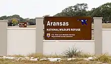 Aransas National Wildlife Refuge is a 115,324-acre (466.7 km2)[1] protected area situated on the southwest side of San Antonio Bay along the Gulf Coast of the U.S. state of Texas. It is located in parts of Aransas, Refugio, and Calhoun Counties. It is situated on the southwest side of the San Antonio Bay, formed by the mouth of the Guadalupe River. It also includes nearly the entirety of Matagorda Island, a 38-mile barrier island.[2] The Aransas National Wildlife Refuge was established by Executive Order 7784 on 31 December 1937 by President Franklin D. Roosevelt as the Aransas Migratory Waterfowl Refuge as a refuge and breeding ground for migratory birds and other wildlife. Roosevelt issued a proclamation in 1940 changing the name to the Aransas National Wildlife Refuge.[3]
