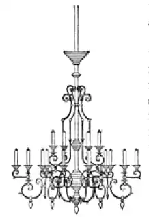 The position that Archer & Pancoast attained in the production of gas fixtures, chandeliers, electric light fixtures, and artistic metal work was universally recognized throughout the US. Their showrooms featured displays, one of which was a great attraction to visitors. The company fitted up with gas fixtures in some of the largest public edifices throughout the country. Hundreds of New York's palatial private residences and extensive commercial buildings also contained their artistic products. The company did an extensive wholesale trade throughout the country. They had branch offices located in Boston and Chicago, both of which were heavily stocked with their specialties.[3]