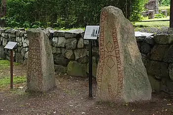 Småland Runic Inscription 2 or Sm 2 is the Rundata designation for a now-lost Viking Age runestone which is believed to be hidden within one of the churchyard walls. Before the historic significance of runestones was understood, they were often re-used as materials in the construction of churches, walls, and bridges. The text of the stone was recorded during one of the earlier national surveys of runestones. It states that the stone was raised by a man named Ábjôrn in memory of a man named Tóki Óníðingr. The name Óníðingr, which with the ó- prefix means the opposite of the Old Norse pejorative word níðingr, was a word used to describe a man as being virtuous. Óníðingr is used as a descriptive word in some runic inscriptions and is translated in the Rundata database as "unvillainous." It is used as a descriptive term on inscriptions Ög 77 in Hovgården, Sö 189 in Åkerby, Sm 5 in Transjö, Sm 37 in Rörbro, Sm 147 in Vasta Ed, and DR 68 in Århus, and appears as a name or part of a name on inscriptions Ög 217 in Oppeby and Sm 131 in Hjortholmen.[3]
