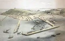 Aerial view circa 1870 from north-east of estate of Arwenack: left on top of hill: Pendennis Castle, built on land belonging to the Killigrew family. Right: Arwenack House. Centre: the developing harbour and town of Falmouth