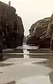 At low tide, there is access to a sand deposit delimited by a rocky wall made from slate and schist forming 30 meters arches resembling cathedral flying buttresses, large caves, sand corridors between rocky blocks, and other geological features. Particularly low tides create access to nearby beaches through the sand extension. As the coast stretch is almost horizontal, the water covers the beach again very quickly.