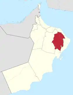 Ash Sharqiyah North Governorate (Arabic: مُحَافَظَة شَمَال ٱلشَّرْقِيَّة, romanized: Muḥāfaẓat Šamāl aš-Šarqīyah, English: Northeastern Governorate) is a governorate of Oman. It was created on 28 October 2011, when Ash Sharqiyah Region was split into Ash Sharqiyah North Governorate and Ash Sharqiyah South Governorate.[1][2][3] The centre of the governorate is the wilāyah (province) of Ibra.