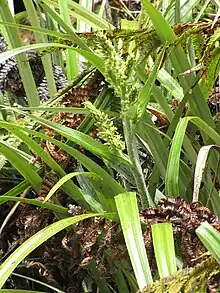 Astelia menziesiana is a species of plant in the Asteliaceae family that is endemic to the state of Hawaii in the United States. Hawaiian names for the plant are kaluaha, paʻiniu, or puaʻakuhinia. It is a non-woody, clumping plant that grows from 1 to 3 feet in width/height. The plant can grow on tree branches and trunks as an epiphyte or in the ground. Leaves are silvery-green or green on top; undersides may be white, gold or silver. Flowers bloom in long spikes in colors including yellow, purple and red. Male and female flowers are on separate plants. Female plants have small orange-yellow berries which are eaten by birds. Two other species: Astelia argyrocoma and the rare and endangered A. waialealae are restricted to the island of Kauaʻi.[1]