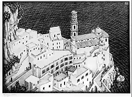 Atrani, Coast of Amalfi is a lithograph print by the Dutch artist M. C. Escher, first printed in August 1931. Atrani is a small town and commune on the Amalfi Coast in the province of Salerno in the Campania region of south-western Italy. Atrani is the second smallest town in Italy and was built right at the edge of the sea. This image of Atrani recurs several times in Escher's work, most notably in his series of Metamorphosis prints: Metamorphosis I, II and III.