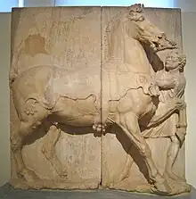 The Pentelic marble relief consists of two plates and there must have been a third piece on the left hand side, containing at least the tail of the horse. The central figure of the relief is a horse moving to the right, with its head pulled upwards away from the right edge of the relief. A portion of the horses nose is missing, the only substantial damage to the piece. Its left foreleg is raised and bent, the right is stretched out and planted firmly in the ground. The hind legs reinforce the horse's position, the left hind leg is in very low relief, only barely extending out of the surface. On the horse's back is a panther pelt, which is attached around its front. At the front, to its left, stands a stable boy who reaches up to strike the horse with a whip, as the pained posture of the horse's head makes clear. The boy wears a chiton. His hair is cut short, but the pattern of the locks indicates that he is an exotic foreigner. It is probably that he is an African slave, most likely from Ethiopia.