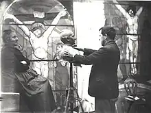 Suter working on a bust of his mother; stained glass windows for Fluntern Reformed Church in background