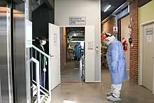 The COVID Austral Solidarity Hospital operated during 2020 and was created exclusively to care for serious COVID-19 patients referred by the public health system.[31] It was promoted with the help of foundations and private companies,[32][33] such as Techint Group, Bayres Bau Werke construction company,[34] foundations such as Sura, Pérez Companc, Phillips, Itaú Bank, Los Pibes, Bunge y Born,[35] Cámara Industrial de Laboratorios Farmacéuticos Argentinos (CILFA), Southworks, Sullair, entre otros.[36] It was inaugurated by Argentinian President Alberto Fernández.[37] During 6 months, 197 patients were hospitalized, which meant 2,940 critical unit bed-days, with more than 300 people actively working at the Solidarity Hospital.[38]