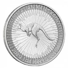 The Silver Kangaroo is a silver coin originating from Australia and produced at the Perth Mint. This is a bullion coin meant for investment in silver. An Australian silver kangaroo coin, produced at the Royal Australian Mint (RAM), is collected for its numismatic value. The obverse of the coin always depicts Queen Elizabeth II. The reverse side features a red kangaroo jumping. Unlike the Australian silver koala and silver kookaburra coins, the reverse image does not change every year. The obverse image on the RAM silver coin does change every year. The mintage every year is unlimited, unlike the koala and kookaburra coins which have a maximum mintage of 300,000 and 500,000 respectively.[1] No special editions or privy marks have appeared for the one-ounce bullion coin.[2]